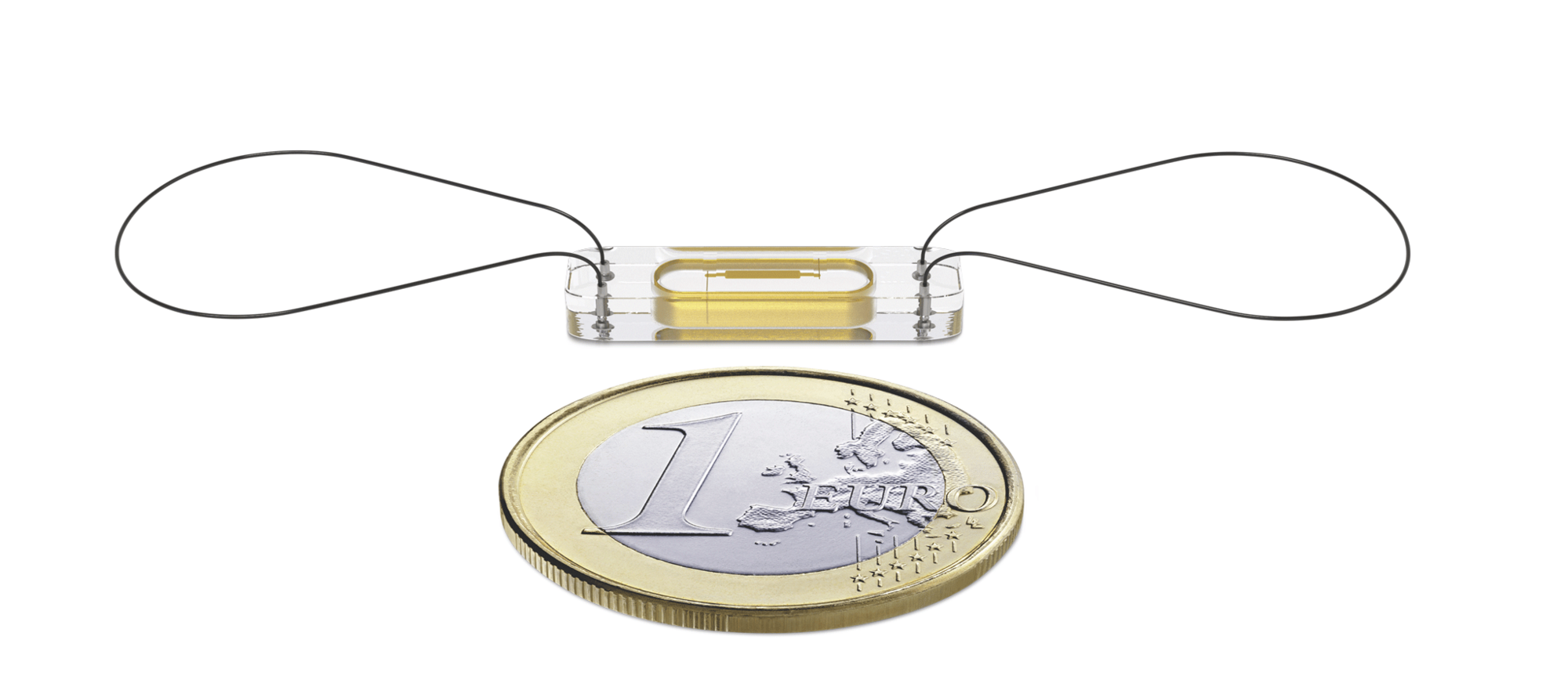 Der CardioMEMS PA-Sensor ist nur etwa so groß wie eine Euro-Münze und trägt an den Enden zwei dünne Schlaufen.