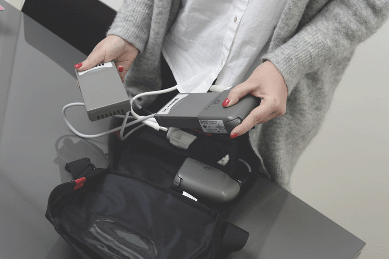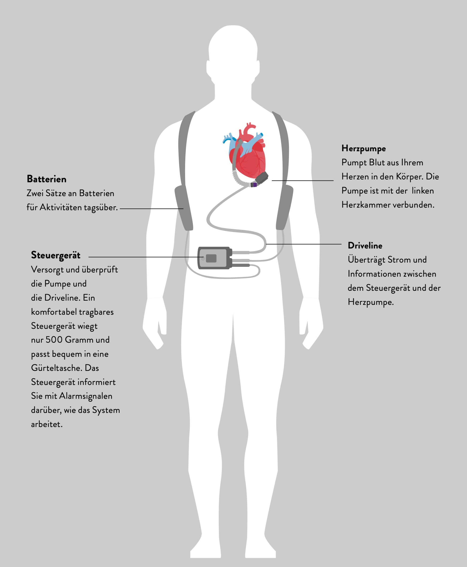 Die LVAD-Pumpe befindet sich im Körper. Die Pumpe muss entweder an eine Steckdose angeschlossen oder mit Batterien verbunden werden, die LVAD-Patient:innen mit sich tragen können. Personen mit einem LVAD tragen außerdem ein Steuergerät mit sich.