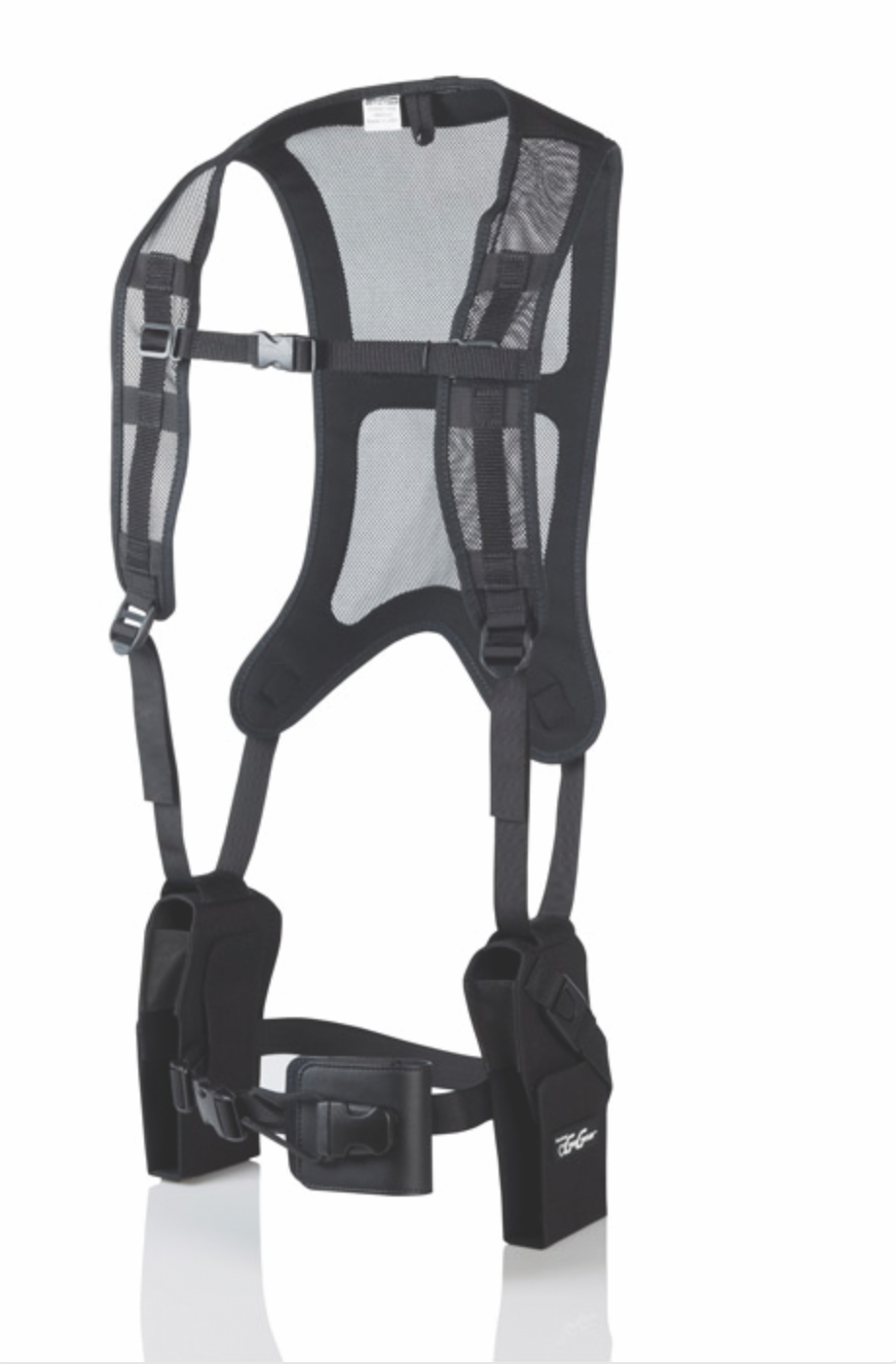 Zwei praktische Möglichkeiten, die Batterien an beiden Seiten Ihres Körpers zu tragen. Beide umfassen einen optionalen Hüftgürtel zum Tragen des Steuergeräts.